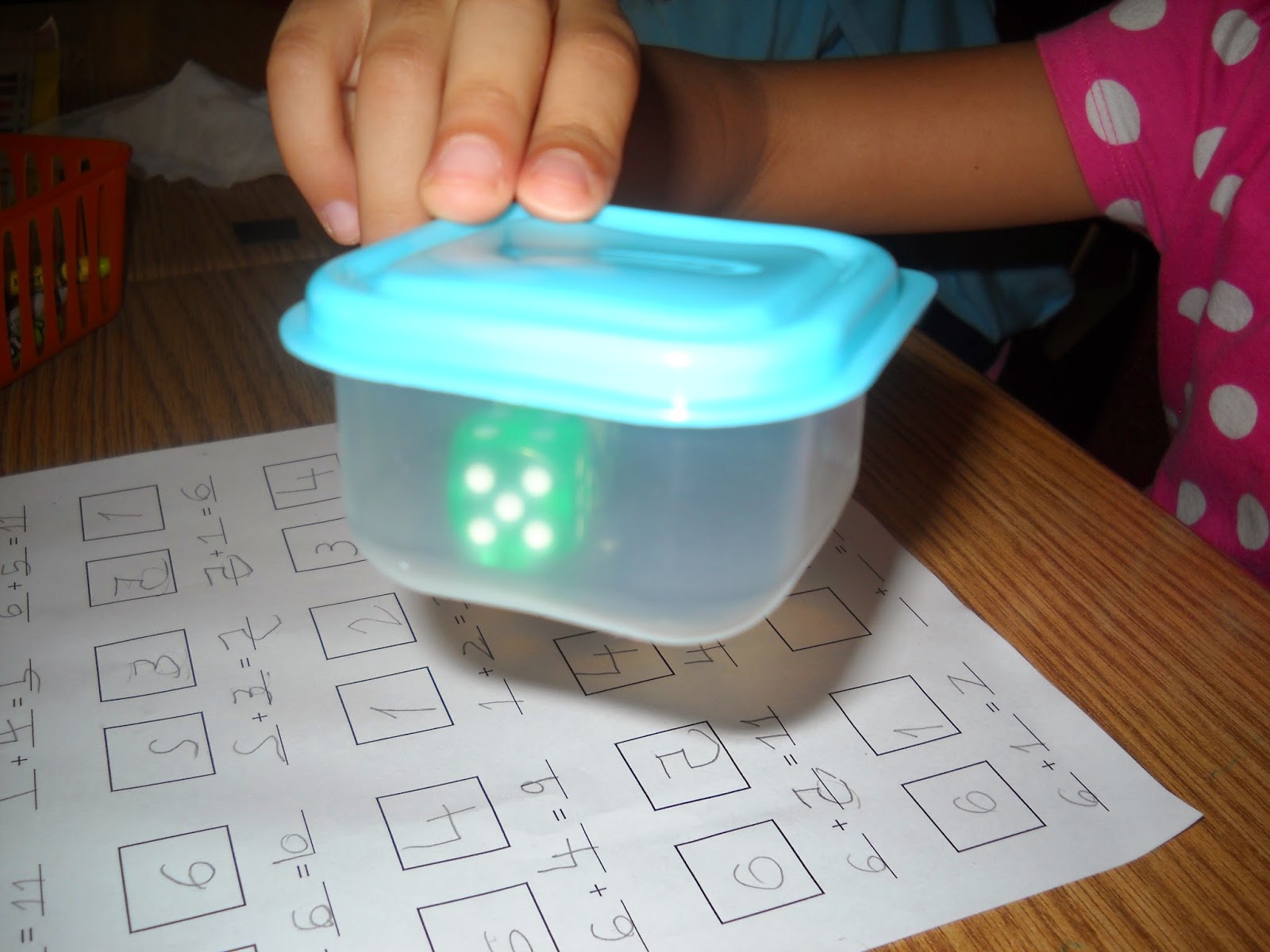This is the dice addition activity I was talking about. The kids did well with this other than the flying dice being strewn (accidentally) around the room. The containers I mentioned are shown below. Again, thank you Pinterest. Now to just find some more at the Dollar Store...